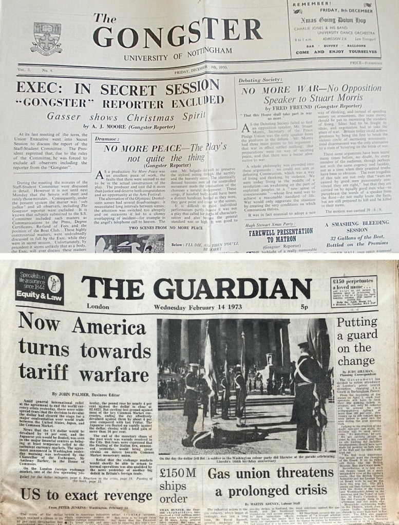 After finishing at Clifton in 1959, Chris went up to Nottingham University. Initially he rowed there but soon gave up early mornings on the River Trent for late nights in smoke filled rooms as editor of the student newspaper, The Gongster.