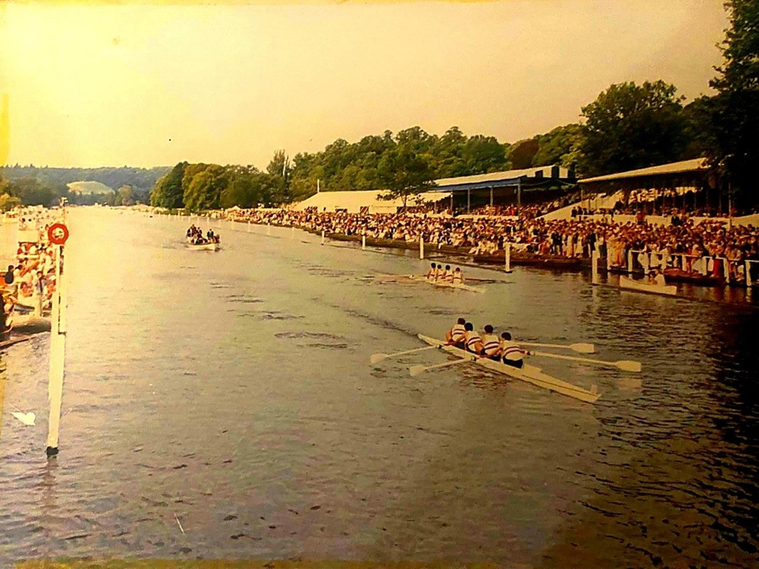 Hugh followed in his father’s footsteps at Bedford School and in 1984 went to Reading, where he was hoping to become a member of the Leander cadets. However, his arrival at Reading coincided with a purple patch for the university, with Hugh’s 1984 crew reaching the final of the Visitors’ Cup, where they lost to the junior four of Shiplake College/Sir William Borlase. Two of the winning crew, Lance Robinson and James Blunt, joined Reading the following year teaming up with Hugh and Nick Strange. The four reached the final, meeting the much-fancied University of London, who stormed off the blocks and were two seconds inside the barrier record, equalled the Fawley record before Reading took the lead at Upper Thames eventually winning by 2 ¾ lengths – the first and only time a full Reading crew have taken home the silverware from Henley. Hugh said that his father had tried to follow the race on a bike but had been unable to go beyond the barrier due to the crowd. He cycled back to the Enclosure, fearing Reading had lost again, only to hear the unforgettable voice of his old school friend and Henley commentator Angus Robertson declaring victory over the Stewards’ Enclosure tannoy system for Reading. With his Scottish ancestry at heart, Michael smuggled in his own bottle of champagne to the Stewards’ Enclosure that he’d bought at Sainsbury’s that afternoon to celebrate what he hoped would be a win for Reading!