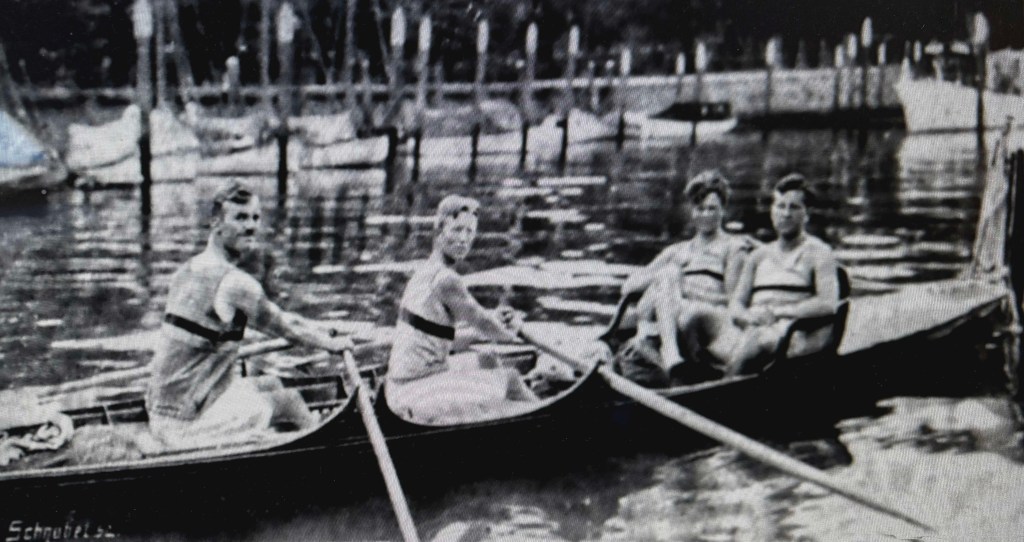 20th July – Left Arnhem in glorious weather and started our long row down the Rhine. Stopped to buy provisions … had an awful job to find a dairy and searched the village followed by half the population! Had swim two hours later. Mrs Wackwitz met us at Wijk and we all dined together.