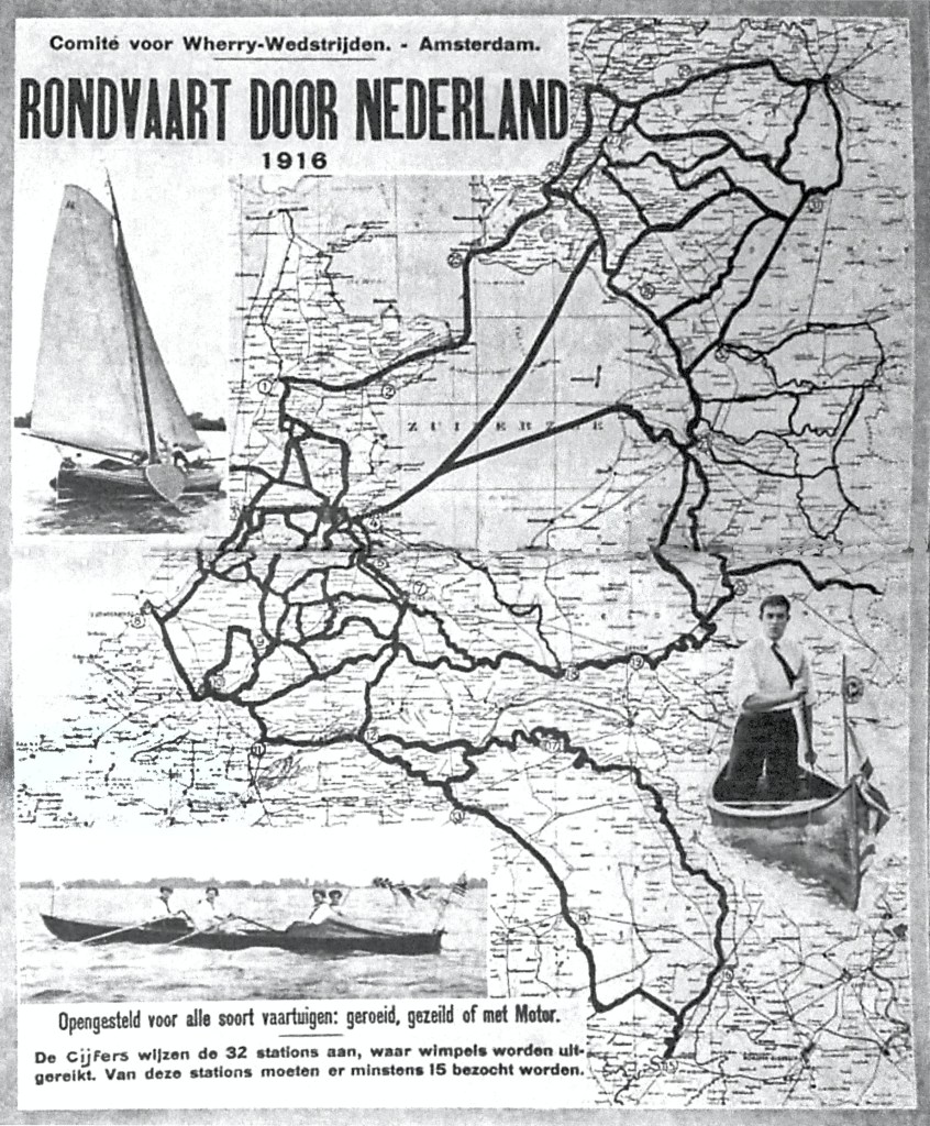 In July, Charles took part in the Rondvaart Door Nederland, a rowing trip along the canals, rivers and lakes of the Netherlands with three colleagues from RV de Laak: H. Eikenhousen, F. H. G. van Benthem van den Bergh and J. D. Wackwitz. The aim of the event was to visit as many towns as possible and collect flags or pennants, which were then displayed on the stern of the boat. The tour could be completed in one of four ways, viz. by rowing or sculling, rowing or sculling in a skiff with a sail, in a sailing boat or motorboat. The previous year there had been a Vijf Provinces Tour on which the 1916 Rondvaart was based.