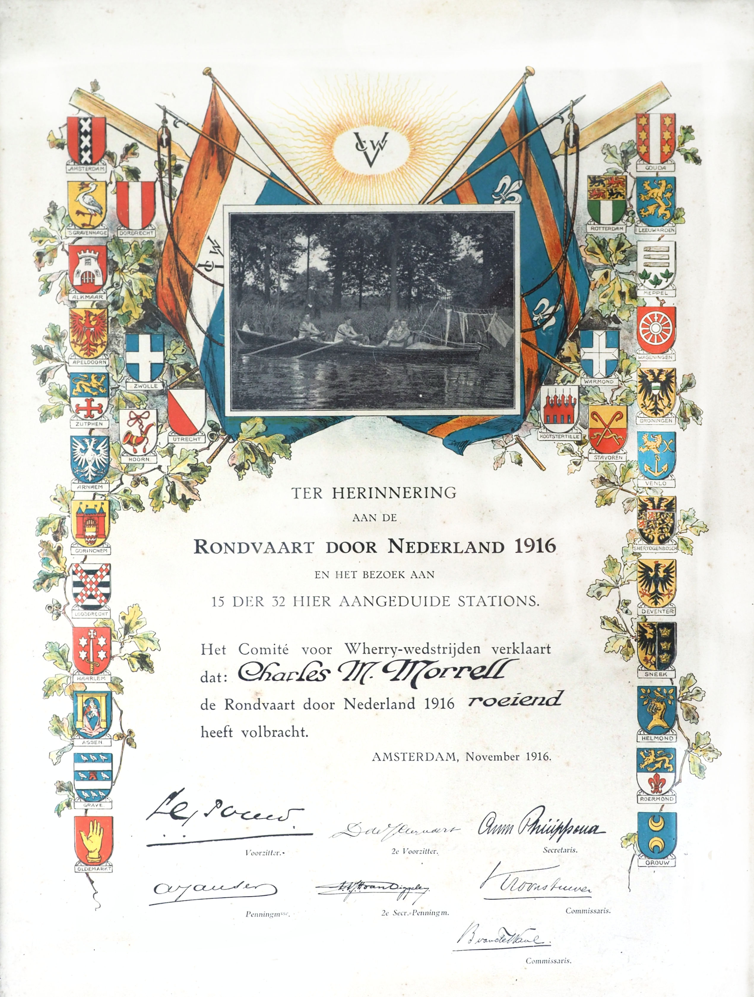 In July, Charles took part in the Rondvaart Door Nederland, a rowing trip along the canals, rivers and lakes of the Netherlands with three colleagues from RV de Laak: H. Eikenhousen, F. H. G. van Benthem van den Bergh and J. D. Wackwitz. The aim of the event was to visit as many towns as possible and collect flags or pennants, which were then displayed on the stern of the boat. The tour could be completed in one of four ways, viz. by rowing or sculling, rowing or sculling in a skiff with a sail, in a sailing boat or motorboat. The previous year there had been a Vijf Provinces Tour on which the 1916 Rondvaart was based.