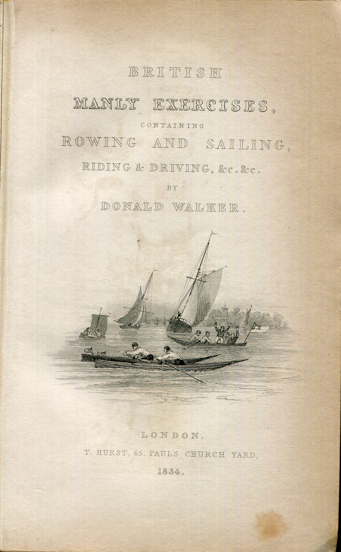 Publishers enhanced title pages with rowing vignettes. The earliest rowing one I’ve seen is on the title page of British Manly Exercises.
