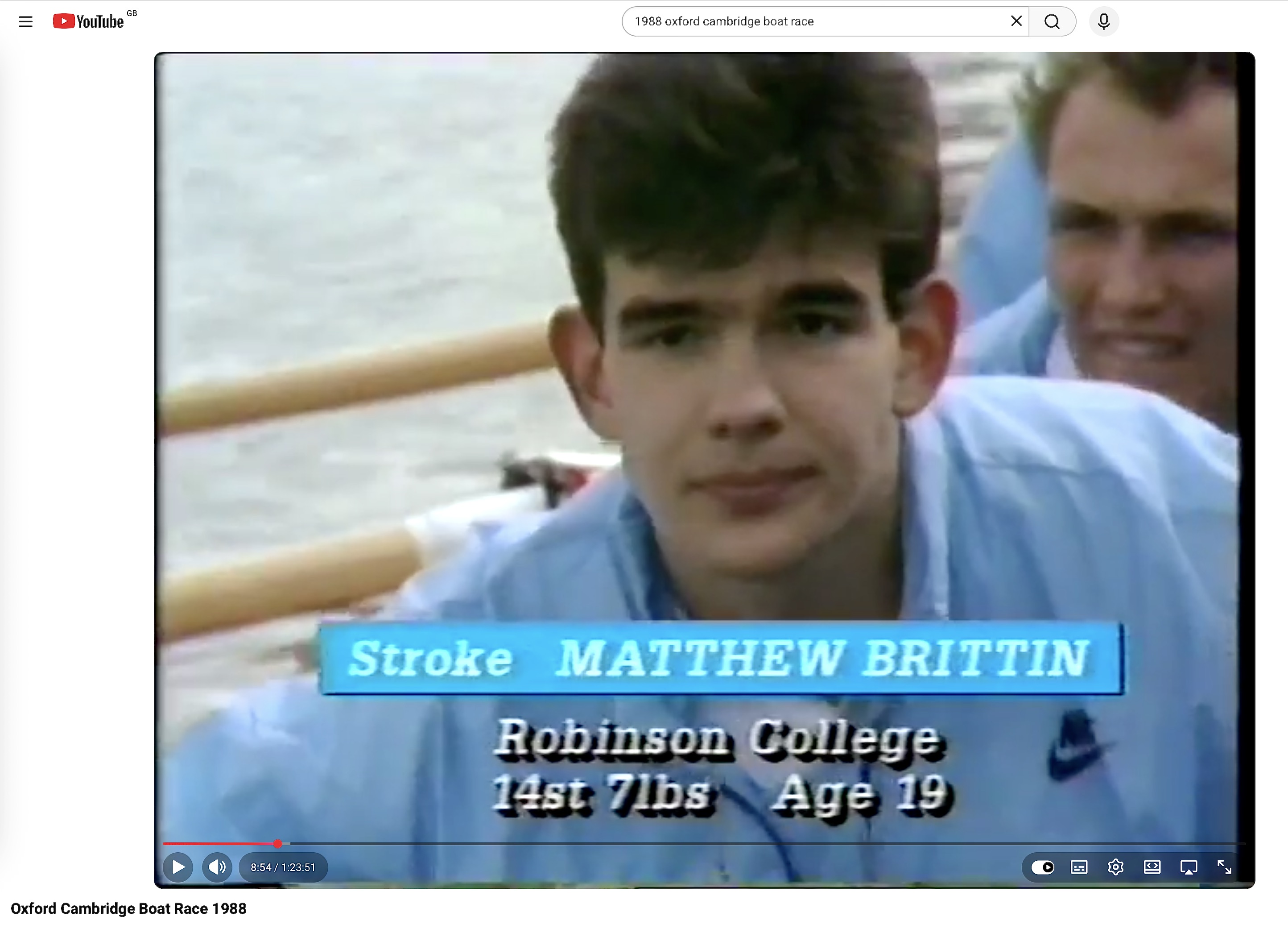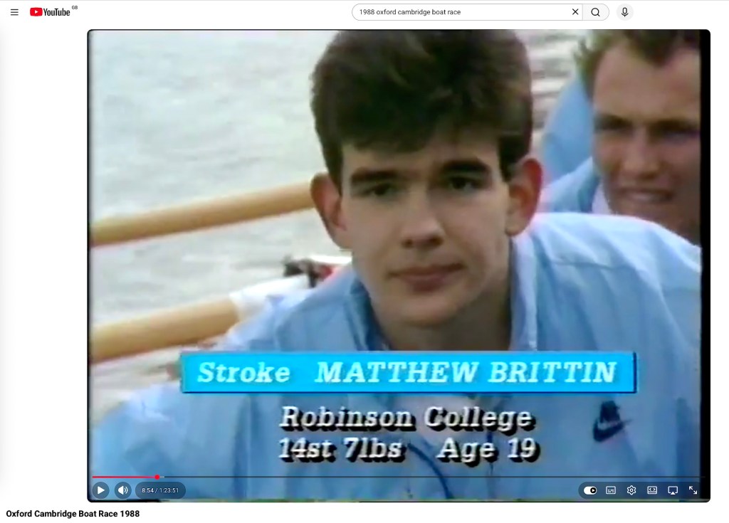 In the Boat Race, Brittin rowed at “4” in 1987, at stroke in 1988 and was back at “4” in 1989. Unfortunately for him, this was at the start of a six-year Oxford winning run, 1987- 1992 and he lost all three of his races. 1987 was particularly painful as it was the year of the so-called Oxford Mutiny and no one expected the Dark Blues to win after such a major disruption.