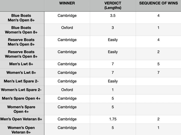 Oxford have been playing catch up with an innovative and wildly successful Cambridge programme and the results of this that manifested on Saturday must have exceeded their most optimistic hopes. Oxford’s women convincingly achieved that most difficult of tasks, ending a long winning run, and their men performed way beyond the pundits’ predictions. The results leave a fascinating set up for next year.