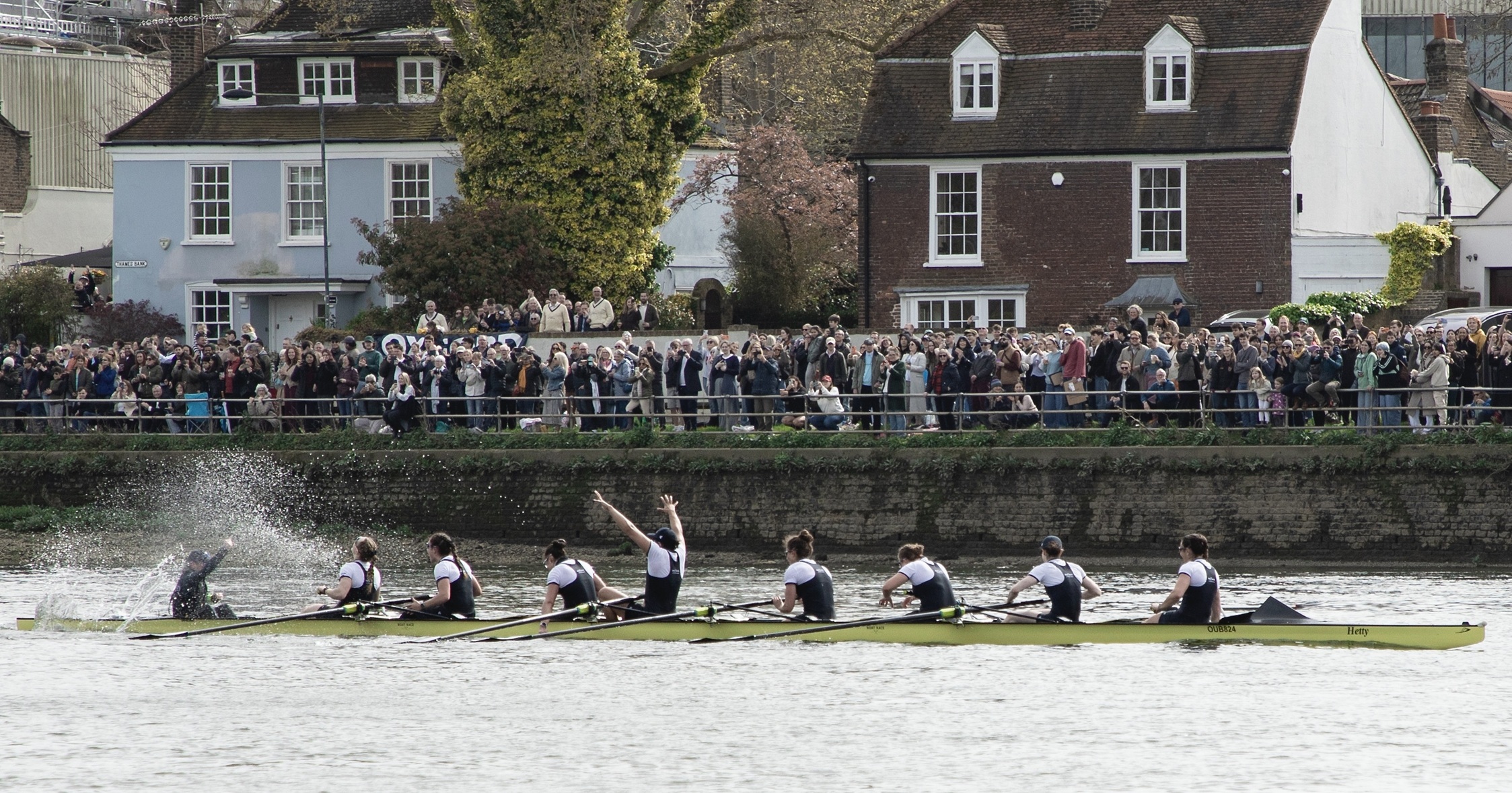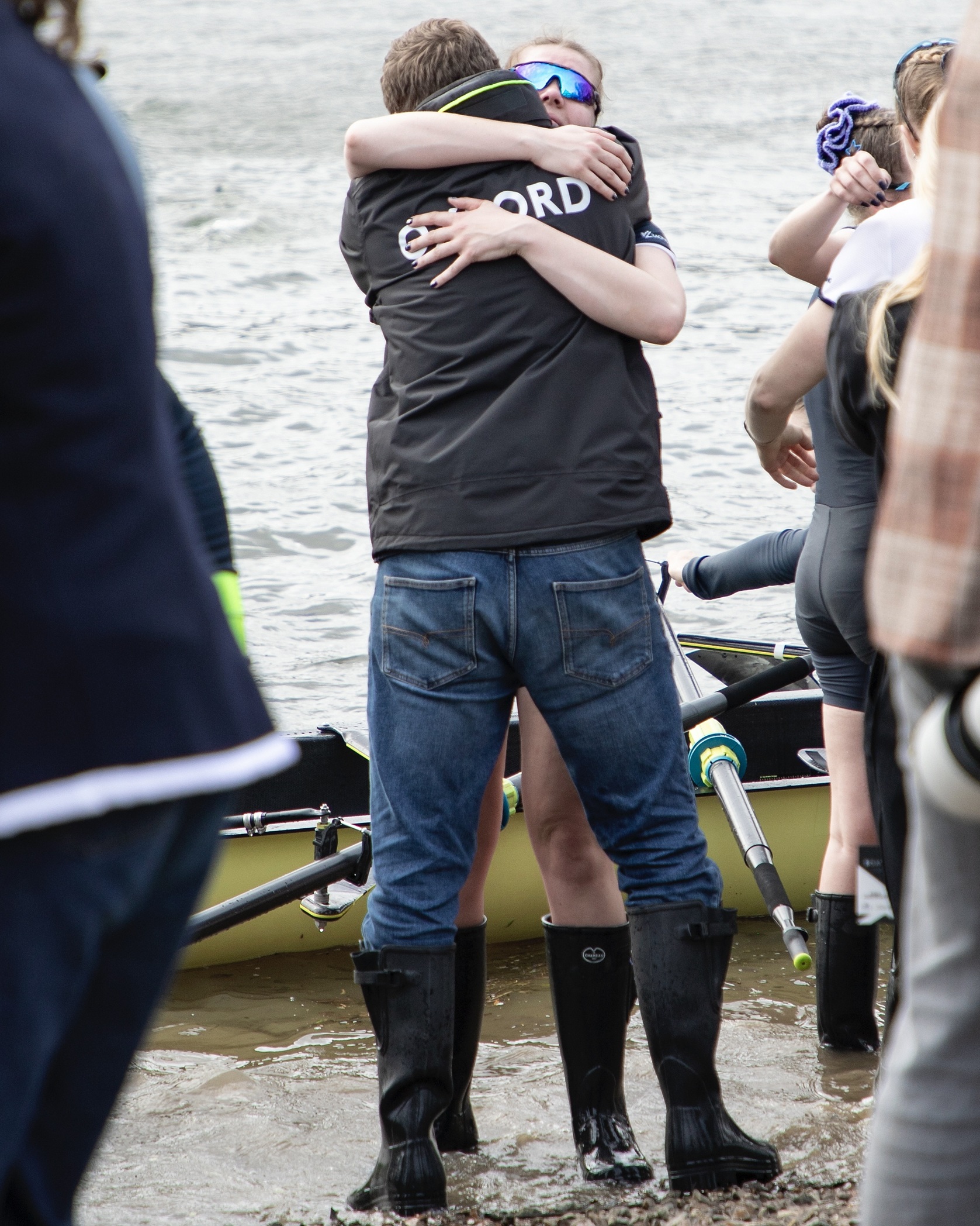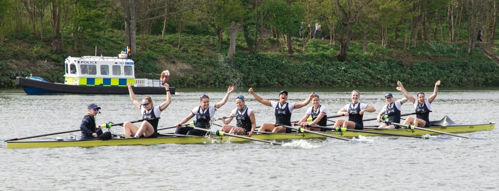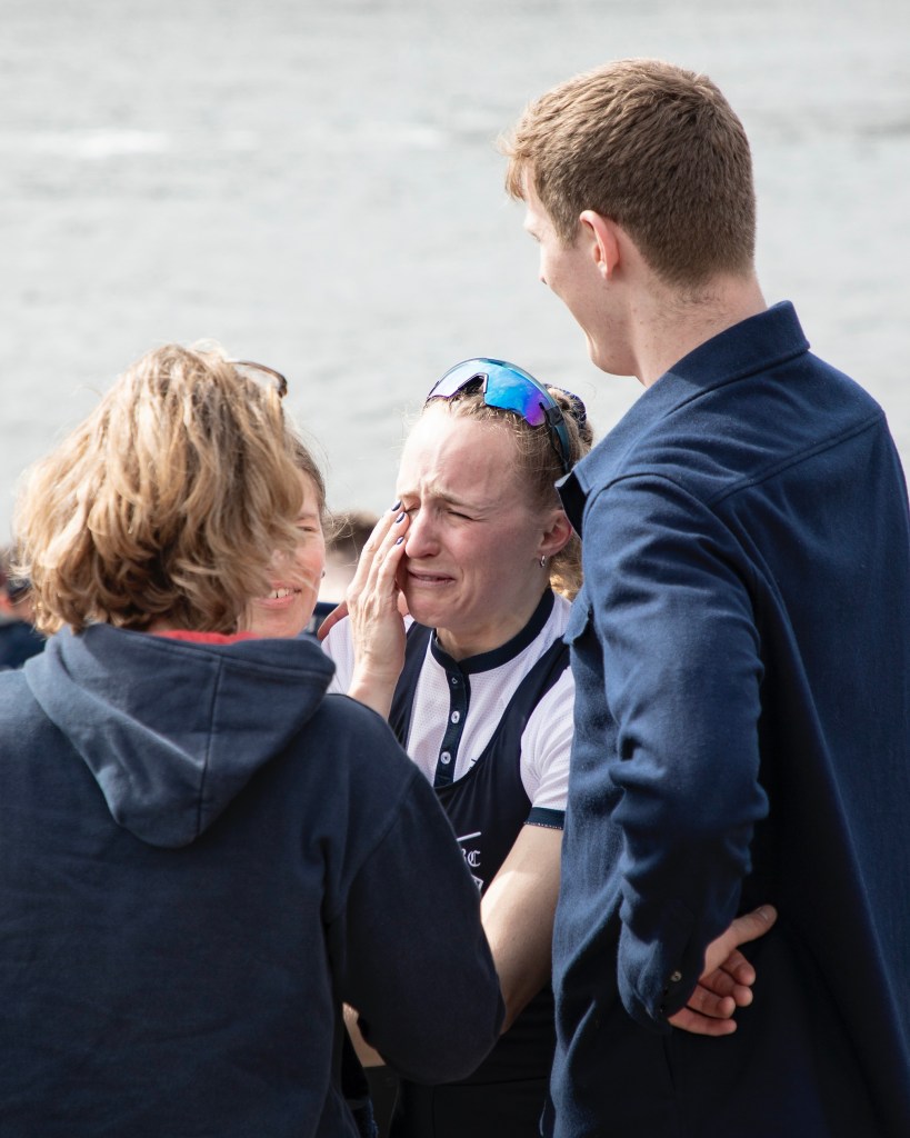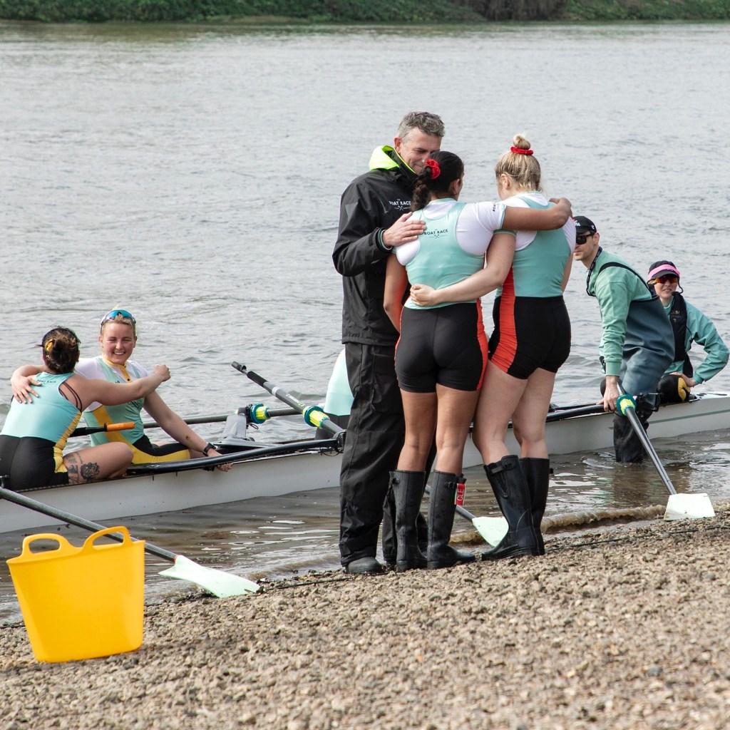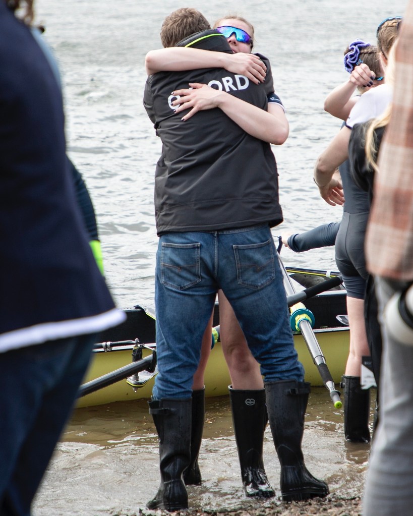 The Mortlake, Anglian and Alpha BC boathouse, provides hospitality for sponsors and important guests.The Oxford Women cross the finish line ending nine years of defeat.Hugs and relief.Two boats, two very different sets of emotions.Oxford acknowledge their supporters on the shore.The Oxford women’s coach, Allan French, seems happy.Sarah Marshall (7, seated) wins on her fourth attempt.Lilli Freischem (3) gets the first of many wet hugs.