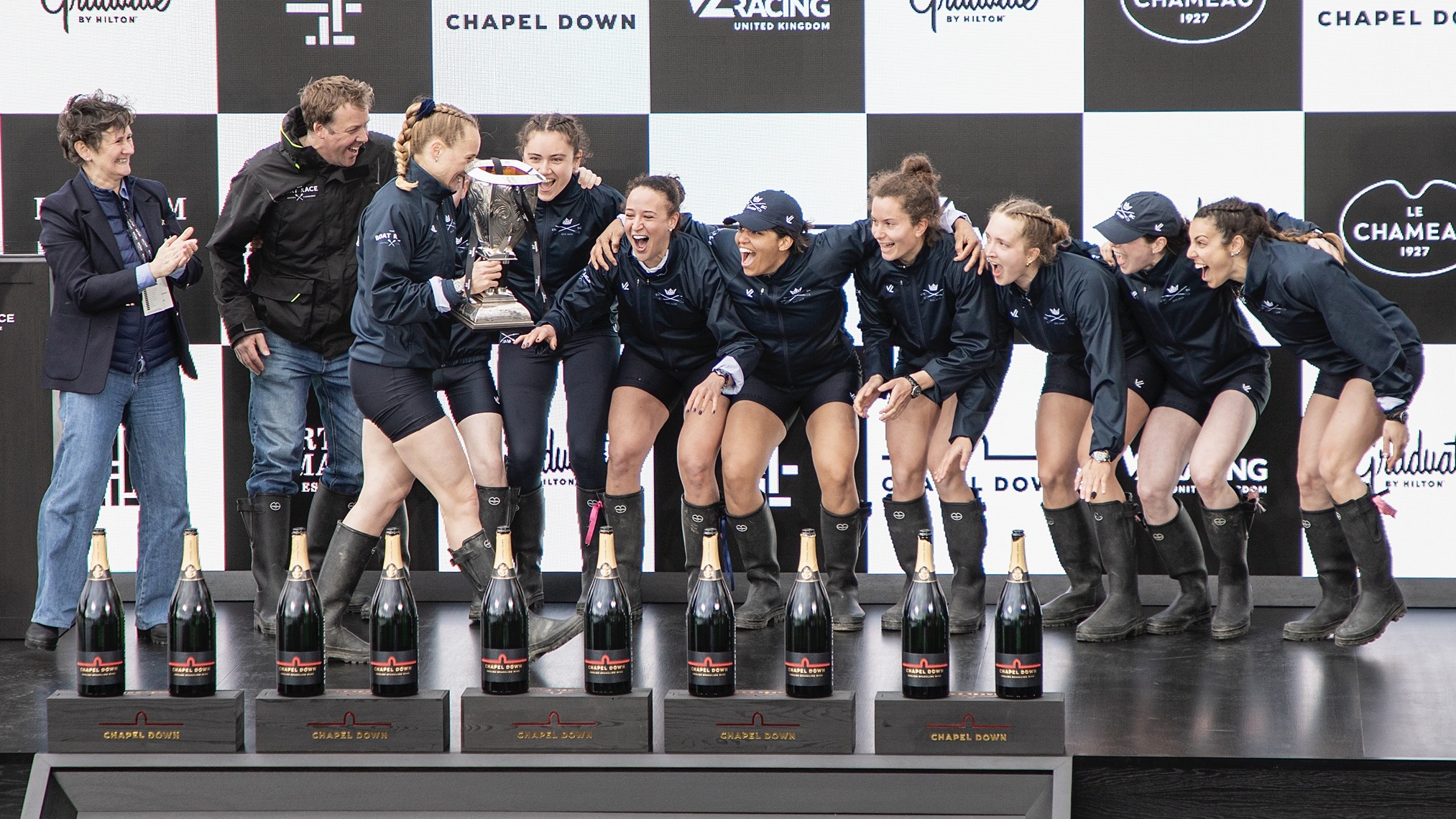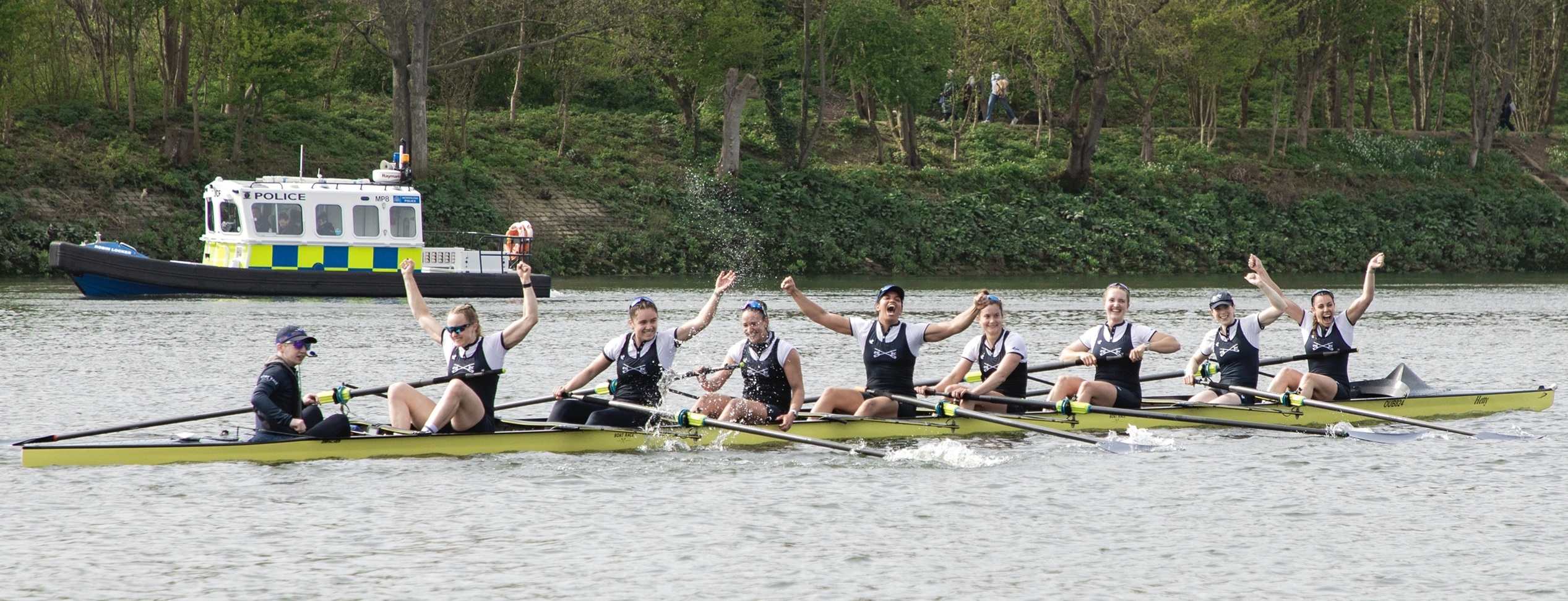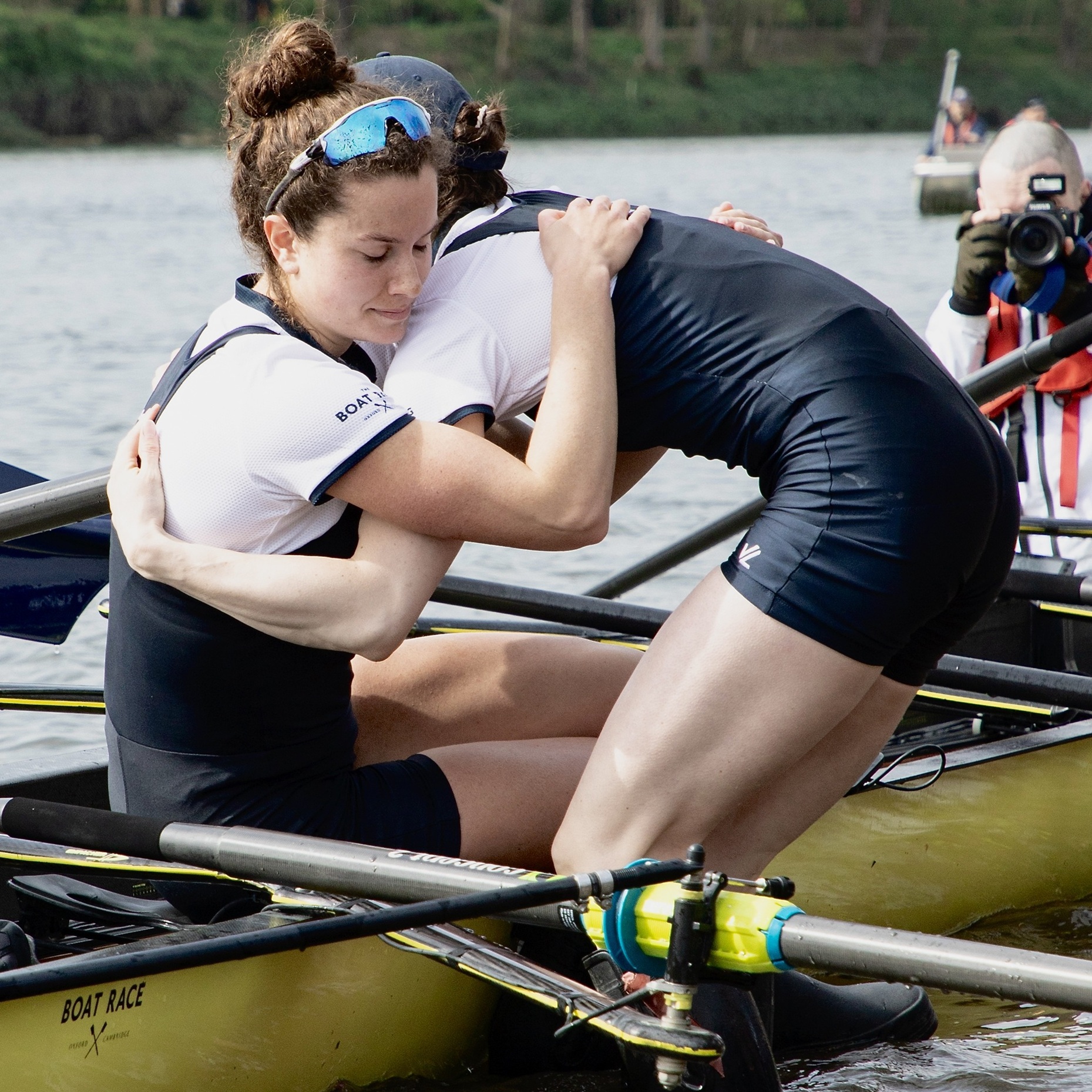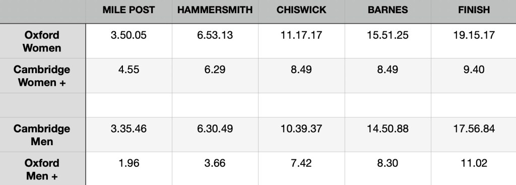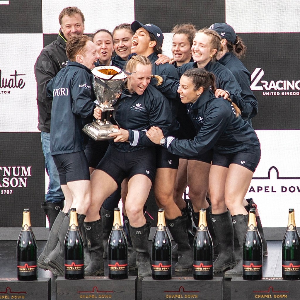 Emily Molins (2, left) and Lilli Freischem (3, right).Coach French embraces victory.Cambridge President Gemma King (Bow) and Florence Brooke of Osiris.What would Oxford stroke Heidi Long be like if she lost?Long and some supporters.The Cambridge Blue Boat victorious.A great effort by Oxford, setting them up well for next year.The Cambridge women’s coach, Paddy Ryan, comforts his rowers while in the background, Blondie celebrate their win.The two Cambridge Presidents, Gemma King and Noam Mouelle.The Oxford women finally receive their elusive trophy.The women’s score now stands at 49-31 in favour of Cambridge.The Cambridge men hold their trophy aloft for the fourth consecutive time. They now have 89 victories to Oxford’s 81.The winning Cambridge crews: the Blue Boat, Goldie and Blondie.The times for the Blue Boats.