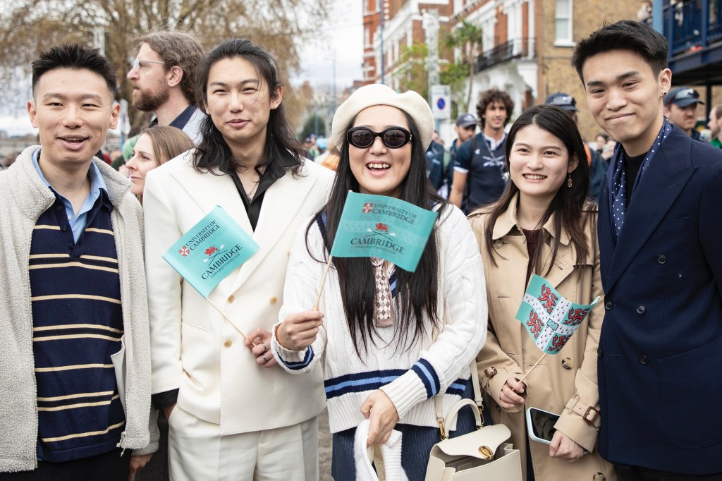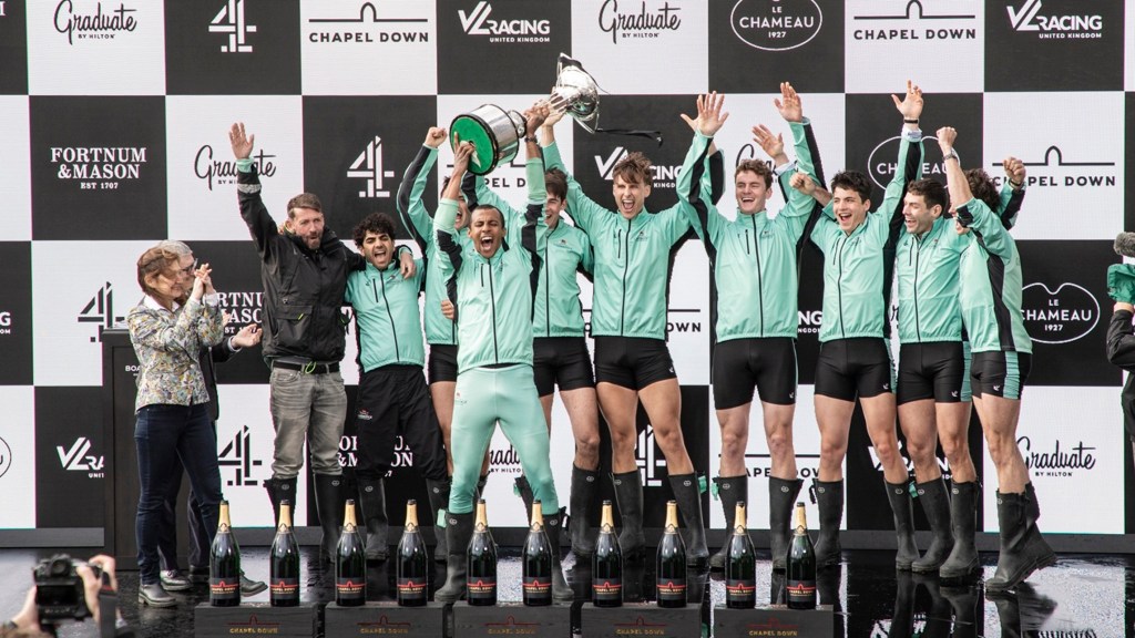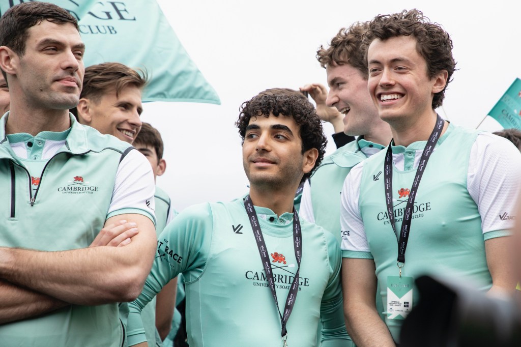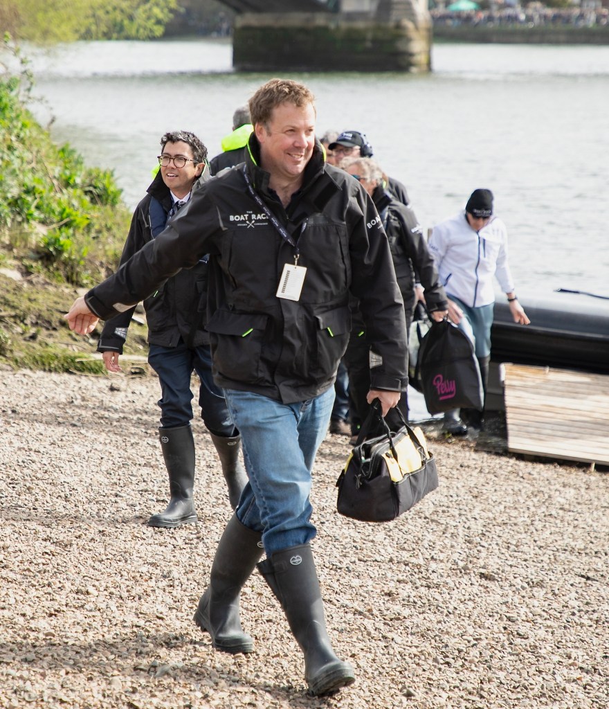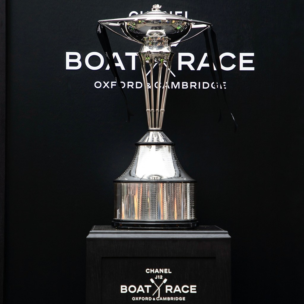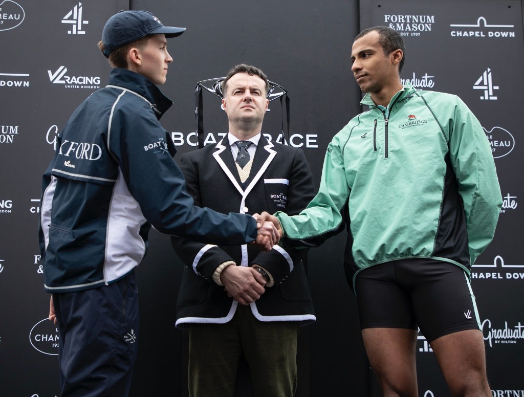 Nick Holland (Oxford, 1982) always cuts a dash on Boat Race Day.Cambridge supporters seemed to adopt a higher profile than those of Oxford.The men’s trophy in place for the coin toss. When it is held by Cambridge, the finial is a lion, when held by Oxford, it is an ox.The Oxford Men’s President, Tobias Bernard, and the Cambridge Men’s President, Noam Mouelle, shake hands while the men’s race umpire, Ciarán Hayes, looks on.Cambridge cox, Sammy Houdaigui, with, to his left, Simon Hatcher and Gabriel Obholzer, and to his right, Kyle Fram and Frederik Breuer.