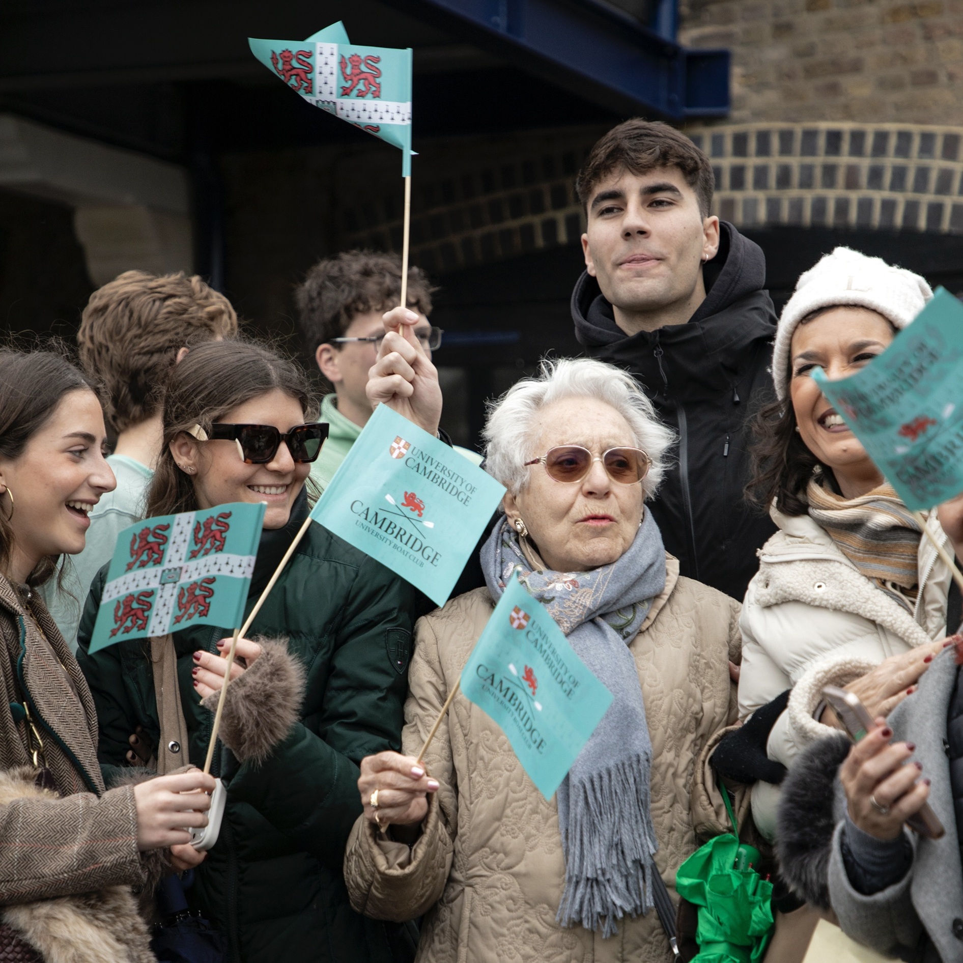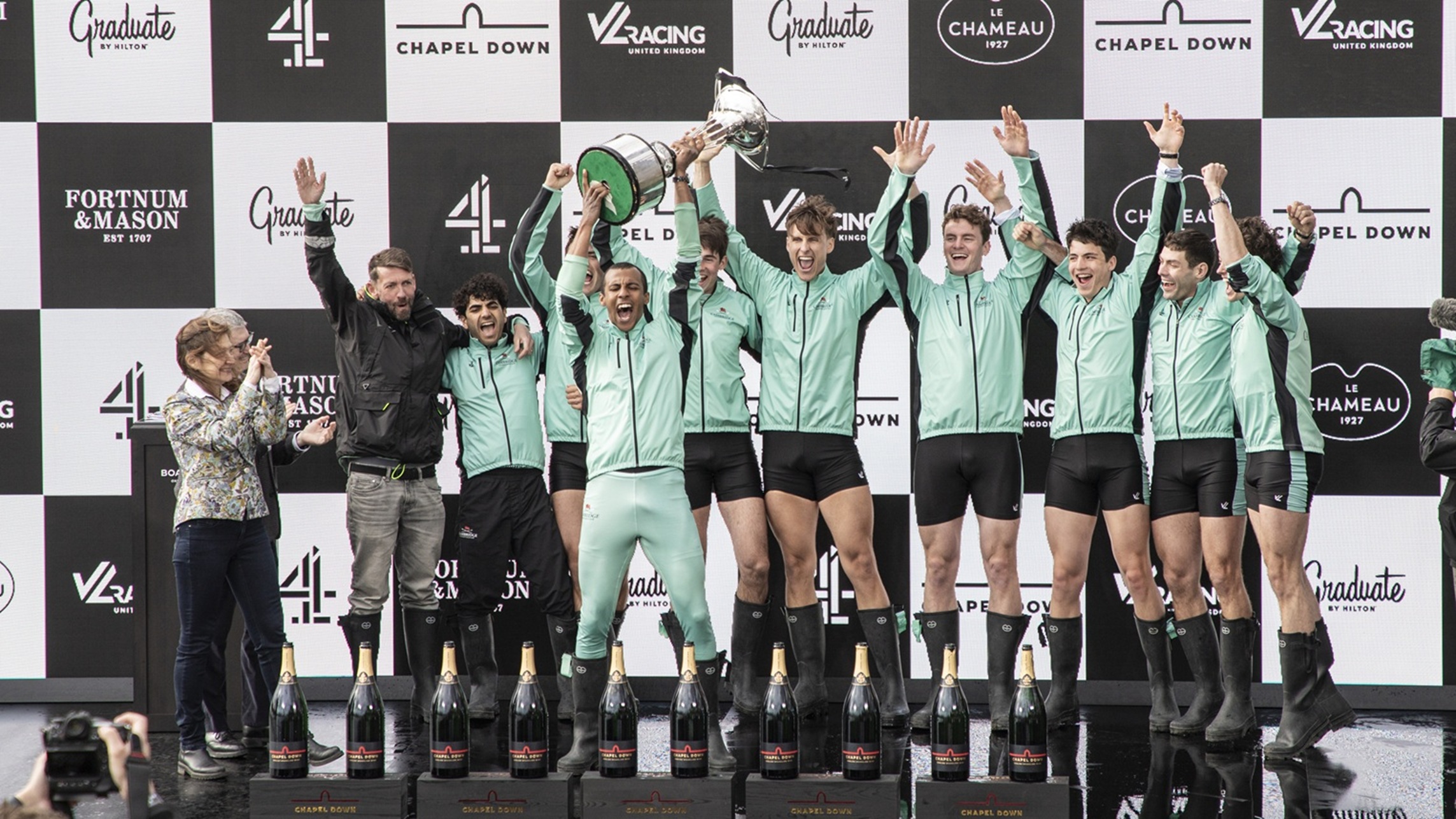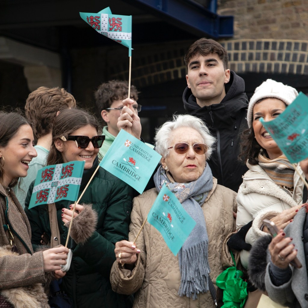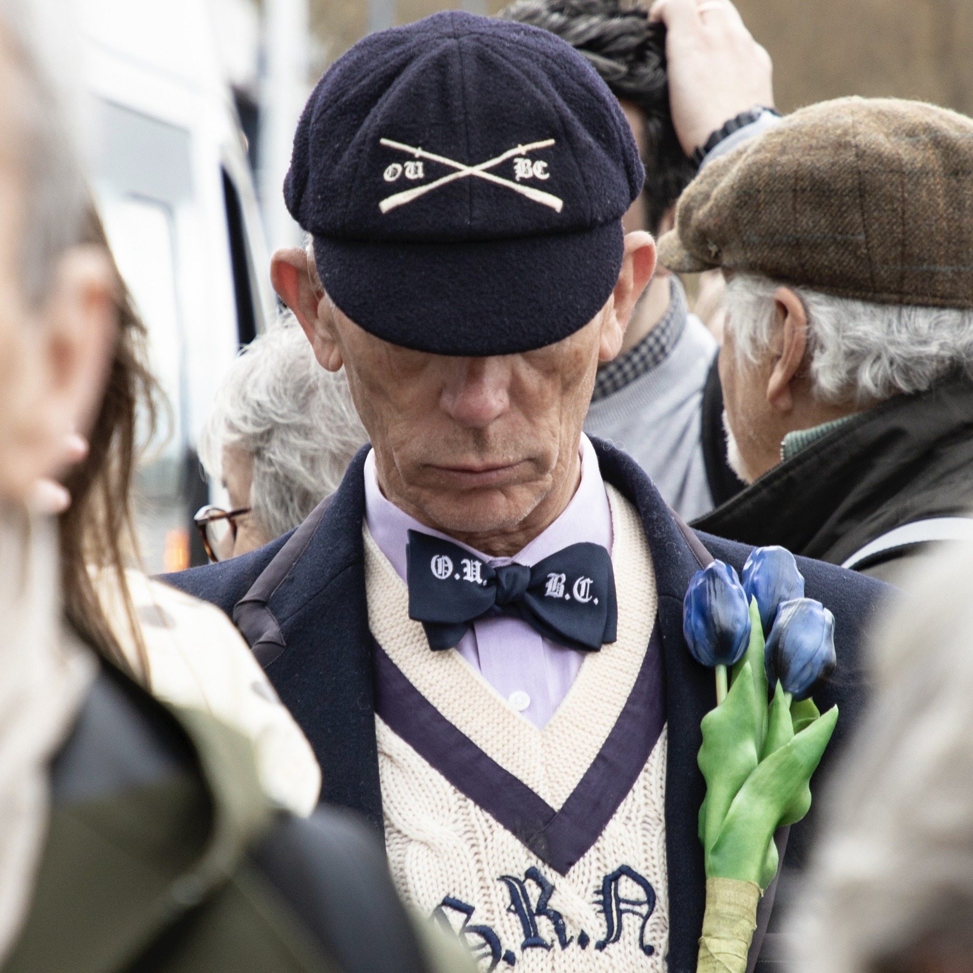 Nick Holland (Oxford, 1982) always cuts a dash on Boat Race Day.Cambridge supporters seemed to adopt a higher profile than those of Oxford.The men’s trophy in place for the coin toss. When it is held by Cambridge, the finial is a lion, when held by Oxford, it is an ox.The Oxford Men’s President, Tobias Bernard, and the Cambridge Men’s President, Noam Mouelle, shake hands while the men’s race umpire, Ciarán Hayes, looks on.Cambridge cox, Sammy Houdaigui, with, to his left, Simon Hatcher and Gabriel Obholzer, and to his right, Kyle Fram and Frederik Breuer.